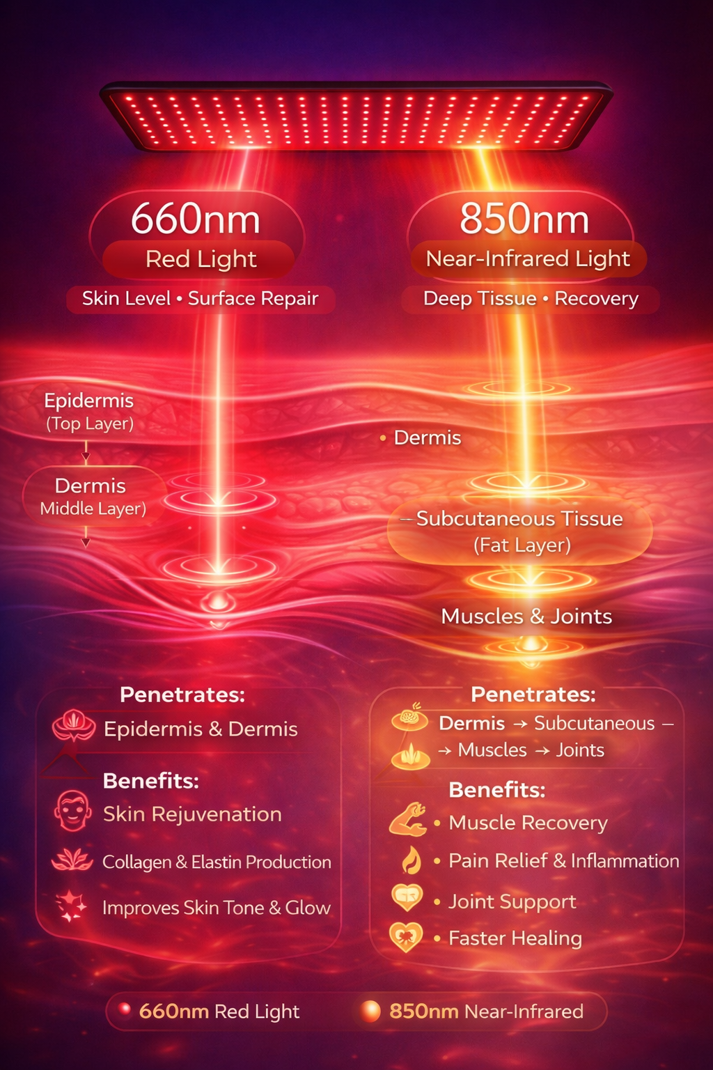 - Wavelengths: 660nm red light + 850nm near-infrared light